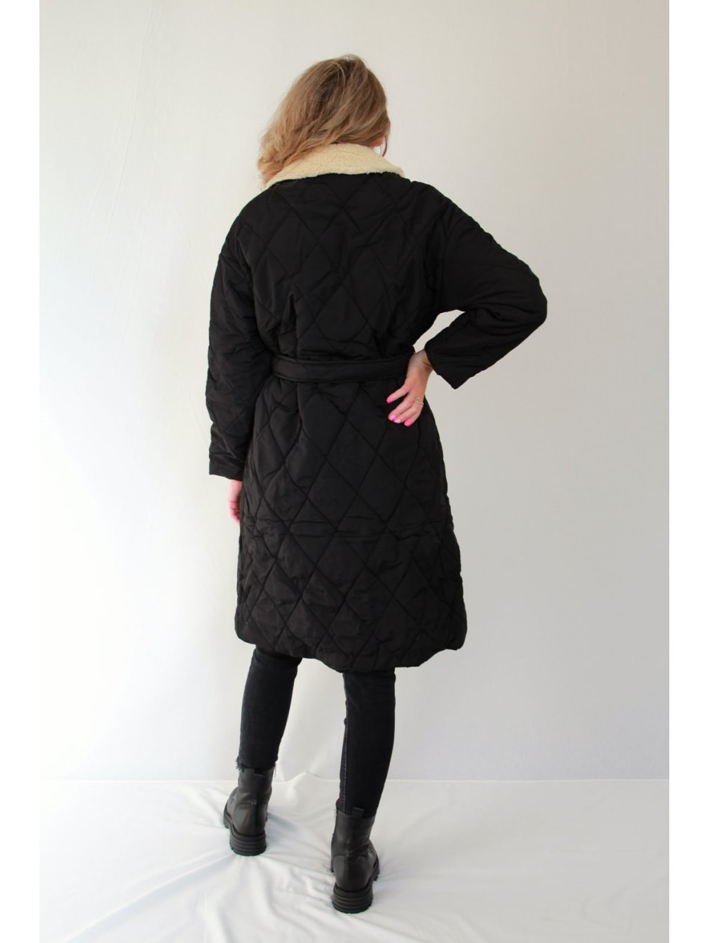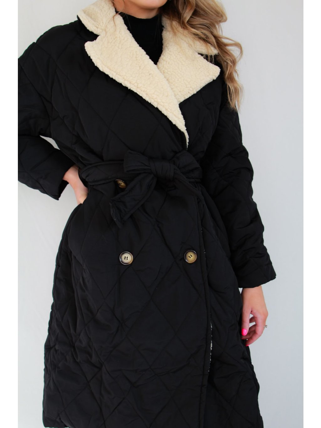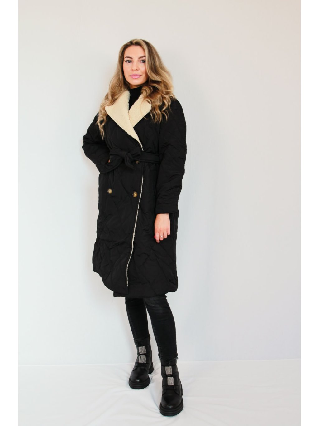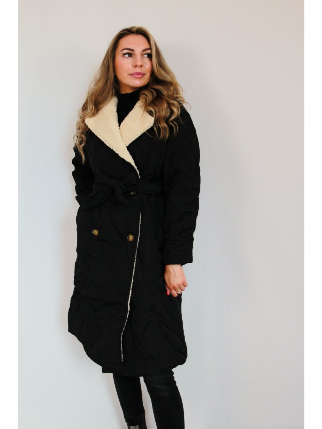 Černý prošívaný dlouhý kabát s teddy límcem a páskem | Adeline