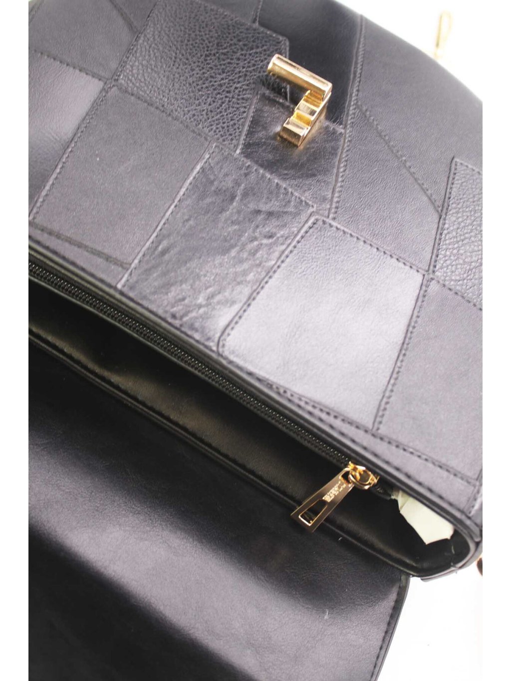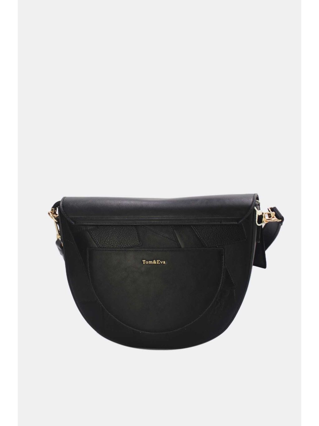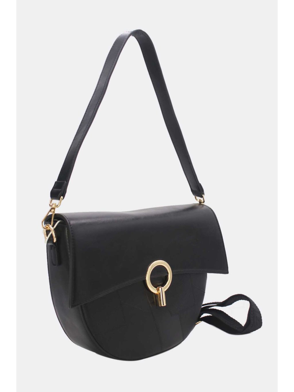 Elegantní černá kabelka Tom&Eva v nadčasovém půlkruhovém tvaru, zdobená luxusním zlatým kováním a výrazným kroužkem na klopě. Díky odnímatelnému a nastavitelnému širokému popruhu ji můžete nosit pohodlně přes rameno i jako crossbody.