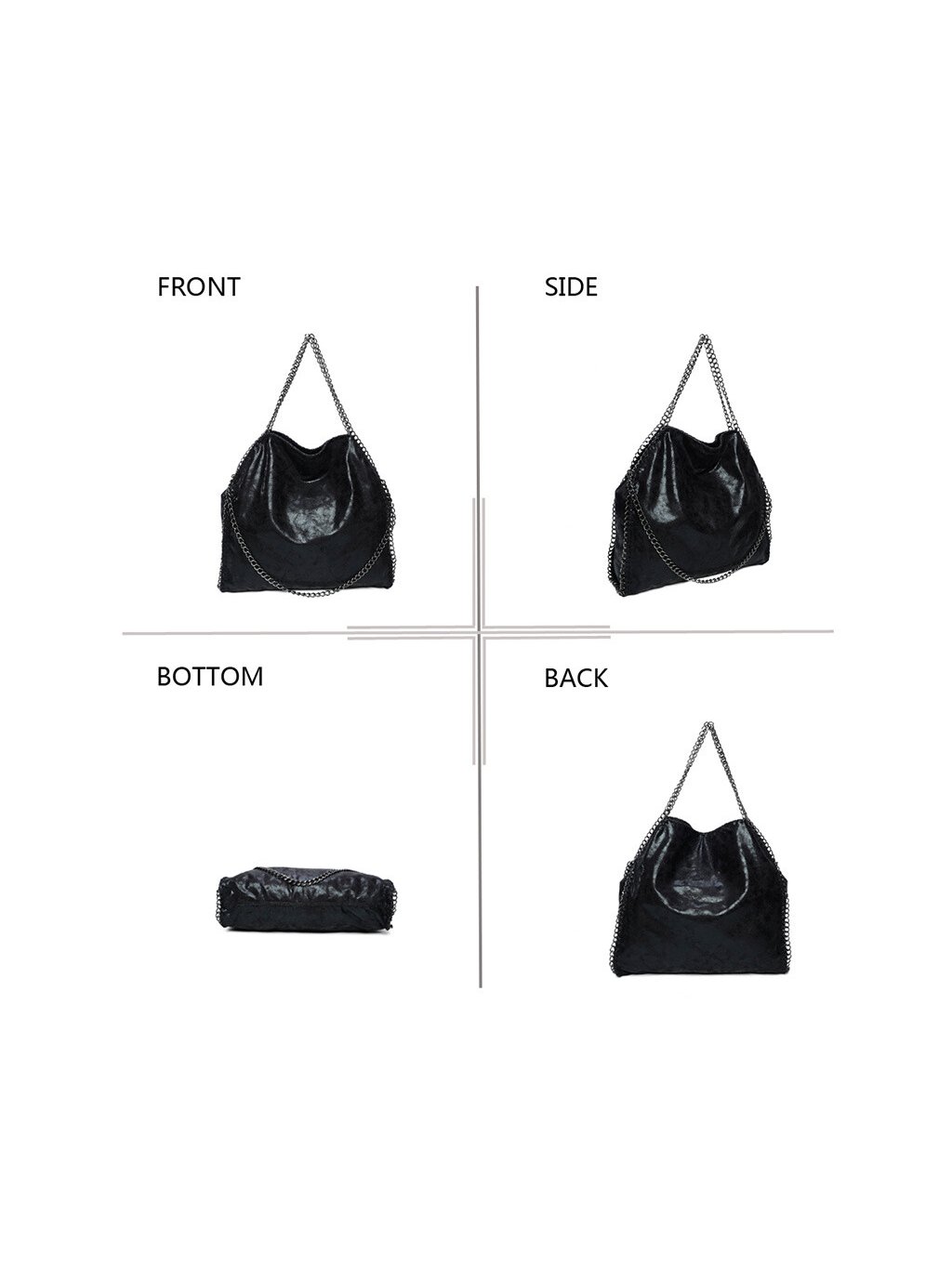 Stylová velká shopper kabelka v elegantní černé barvě s výraznými kovovými řetízky po obvodu a jako ramenní popruhy. Lesklý povrch dodává kabelce luxusní vzhled, zatímco prostorný interiér zajišťuje dostatek místa pro všechny vaše nezbytnosti. Perfektní volba pro každodenní nošení i večerní outfit s výrazem glamour.