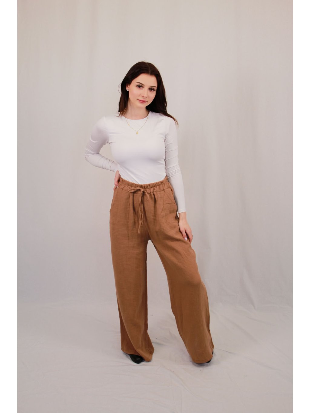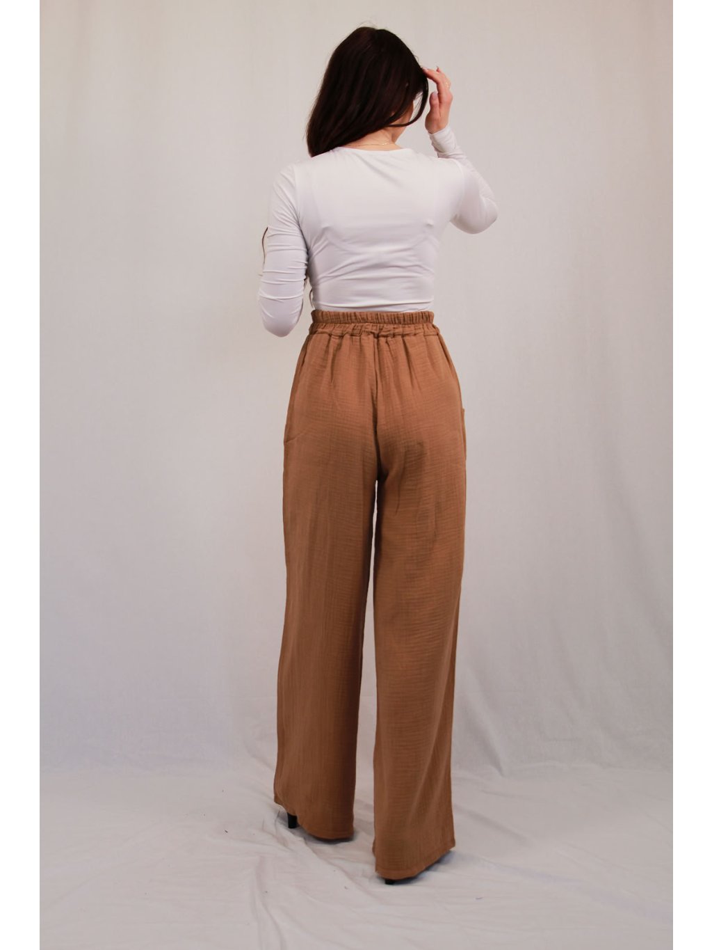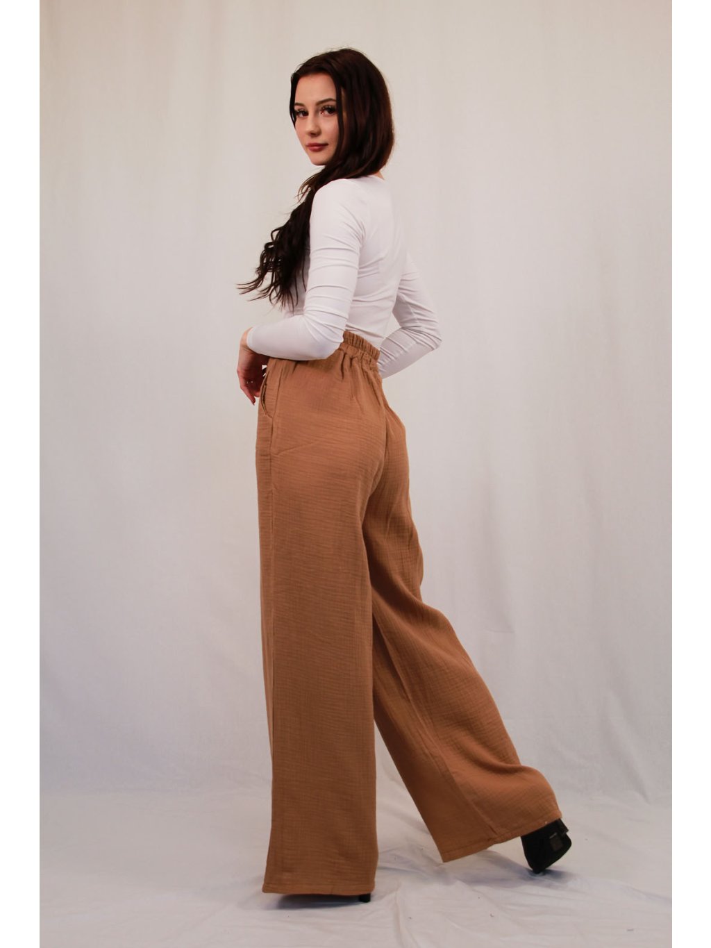 Hnědé mušelínové široké kalhoty s pružným pasem | Siena