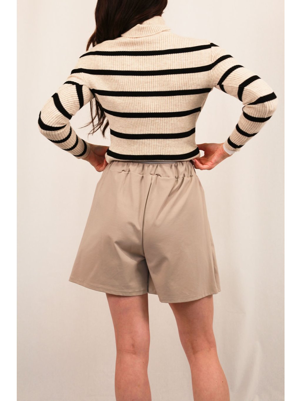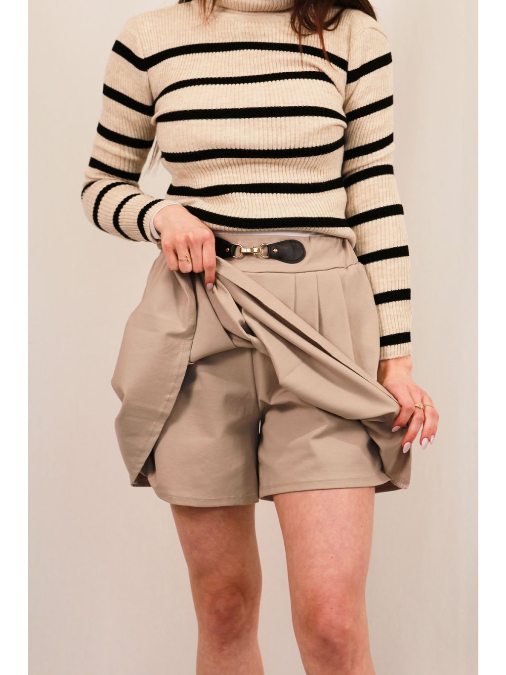 Elegantní a praktická v jednom – béžová skort sukně Lorella kombinuje nadčasový střih áčkové sukně s pohodlím kraťasů ukrytých uvnitř. Výrazný černý pásek se zlatou sponou vytváří kontrastní detail, který podtrhne každý outfit. Perfektní volba do města, na schůzku i na procházku v parku – Lorella bude vypadat skvěle s košilí, topem i svetrem.