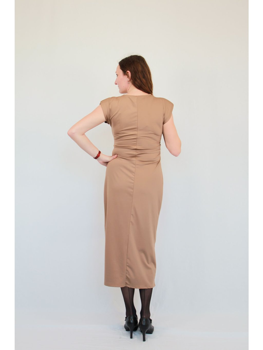 Karamelově hnědé strečové šaty s cap rukávem a nabíraným pasem | Sivelle