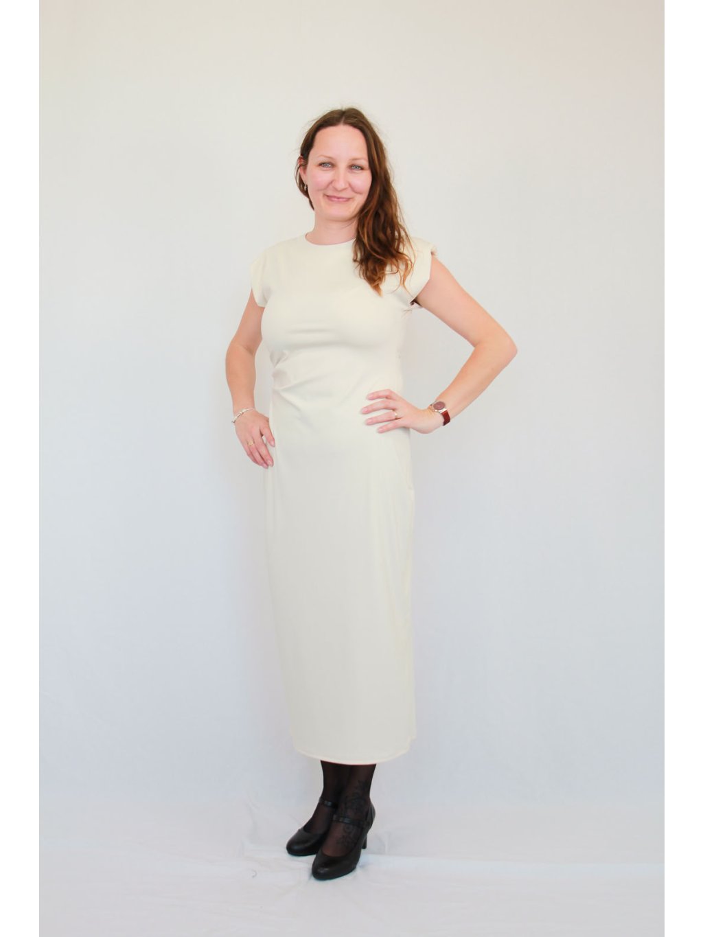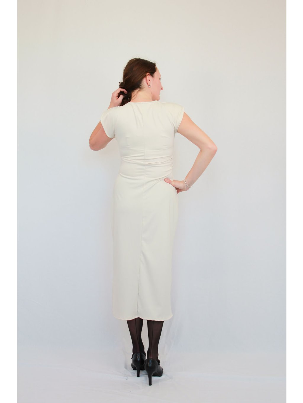 Krémové strečové šaty s cap rukávem a nabíraným pasem | Vivette