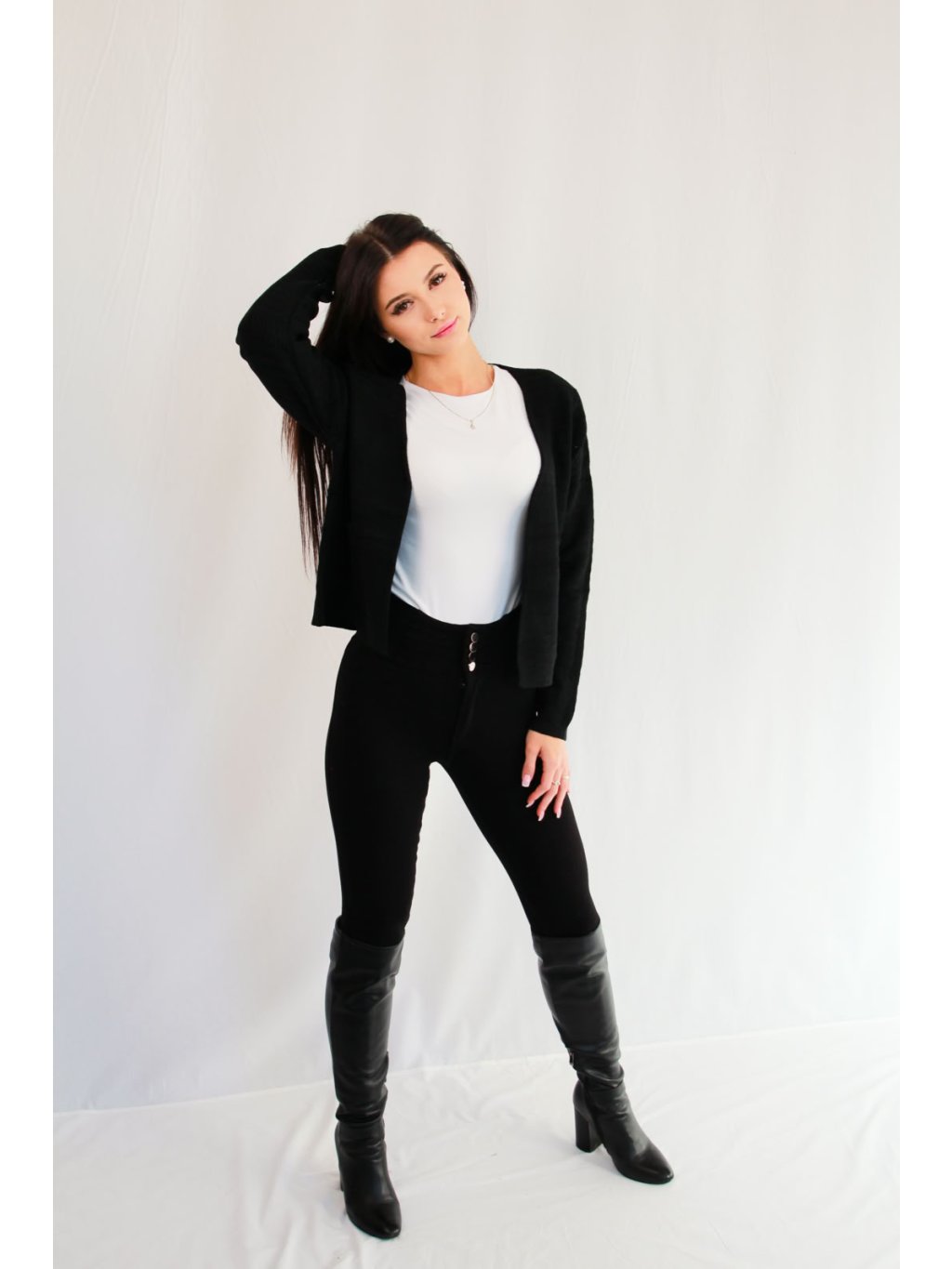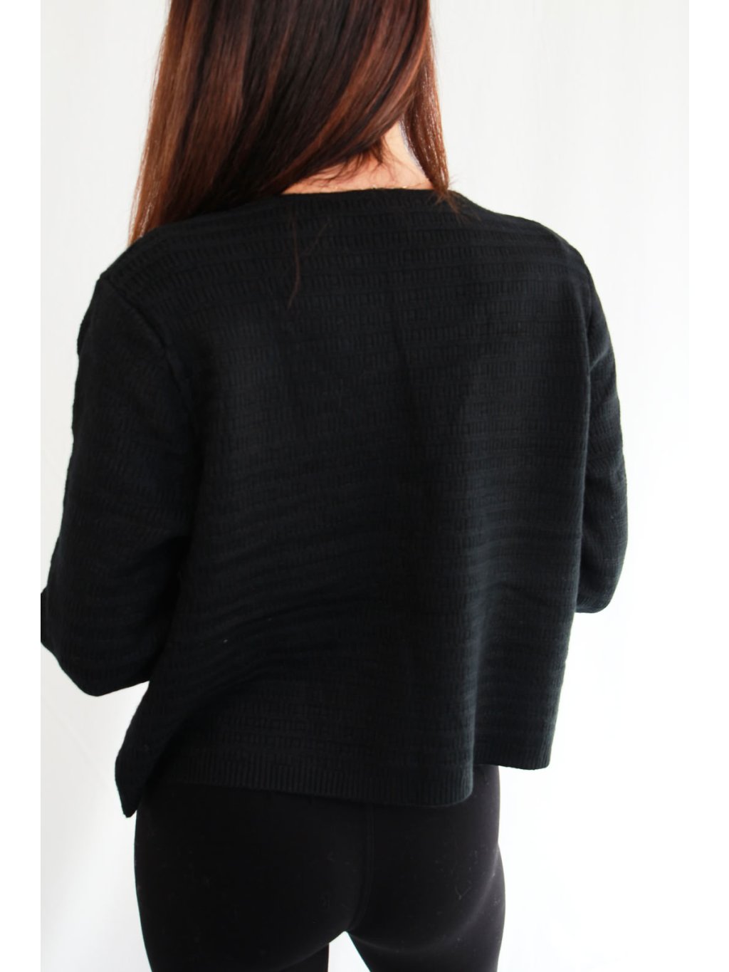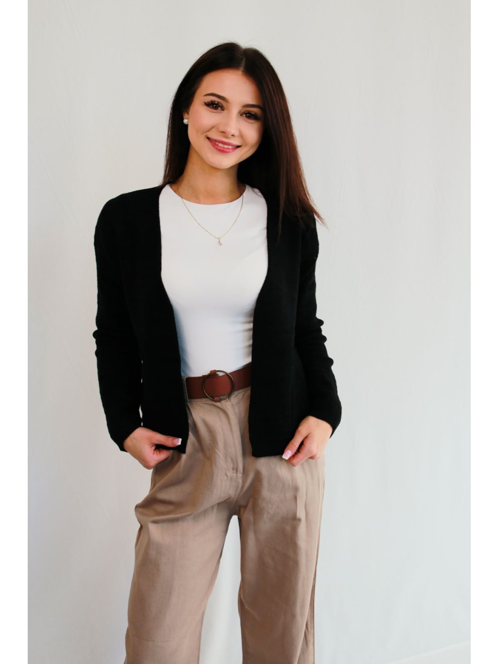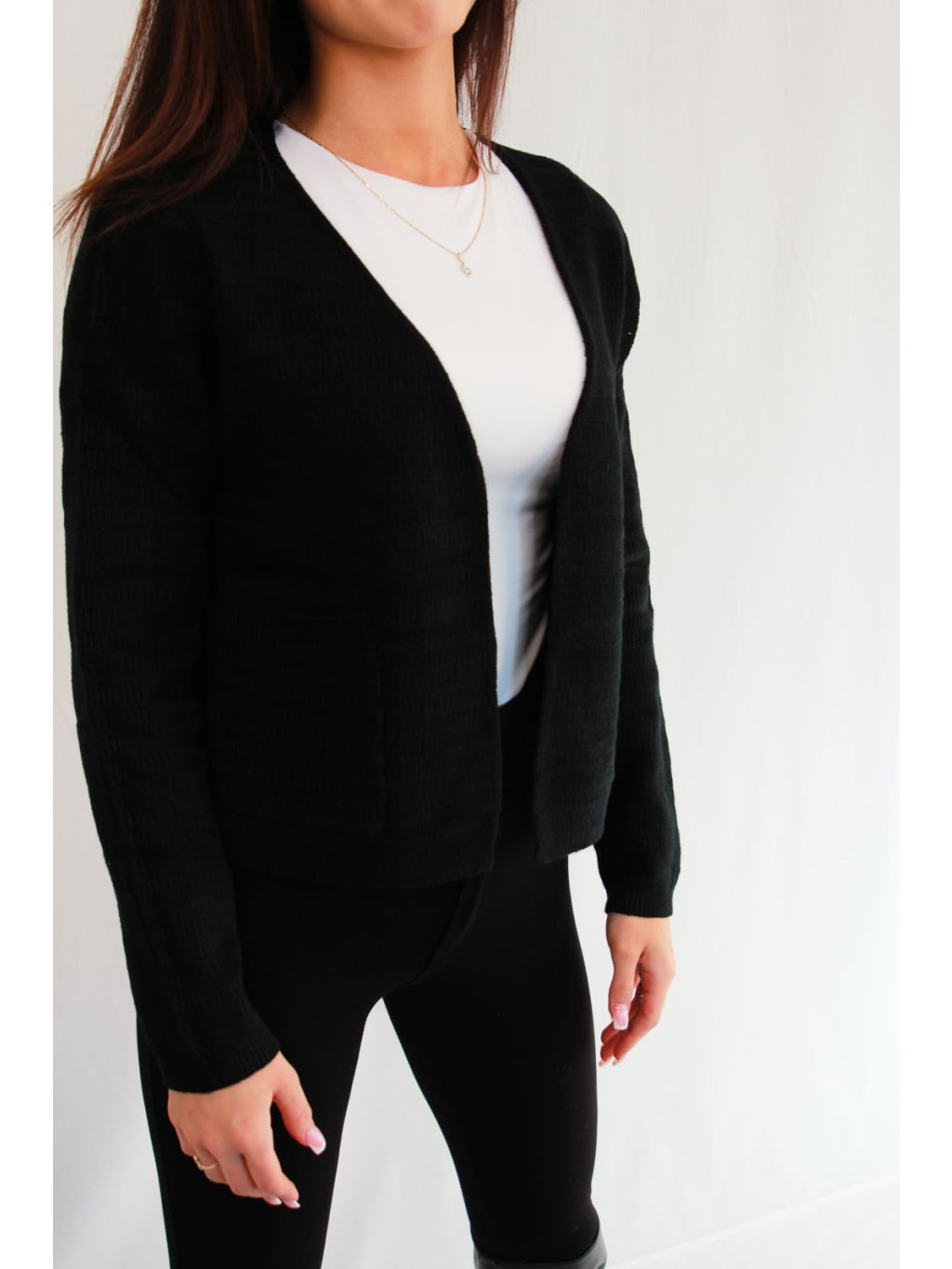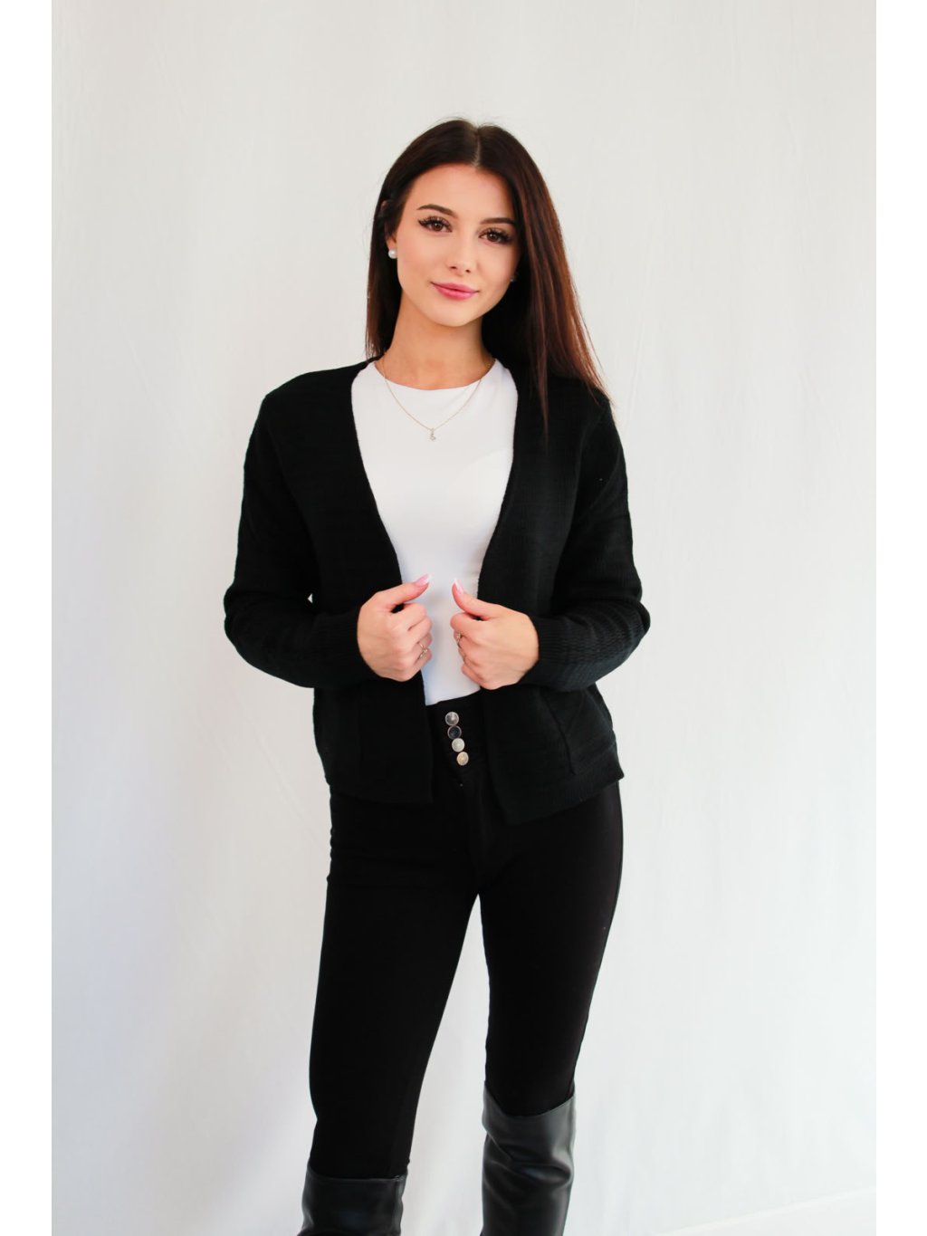 Krátký kardigan bez zapínání v čisté černé barvě s jemně strukturovaným vzorem. Má rovný, lehce boxy střih do pasu a dlouhé rukávy. Přední díl je otevřený, zakončený hladkým lemem. Na bocích jsou našité praktické kapsy. Zadní díl je čistý, bez švových detailů. Snadno ho navrstvíte přes tričko i košili – od kanceláře po volný čas.