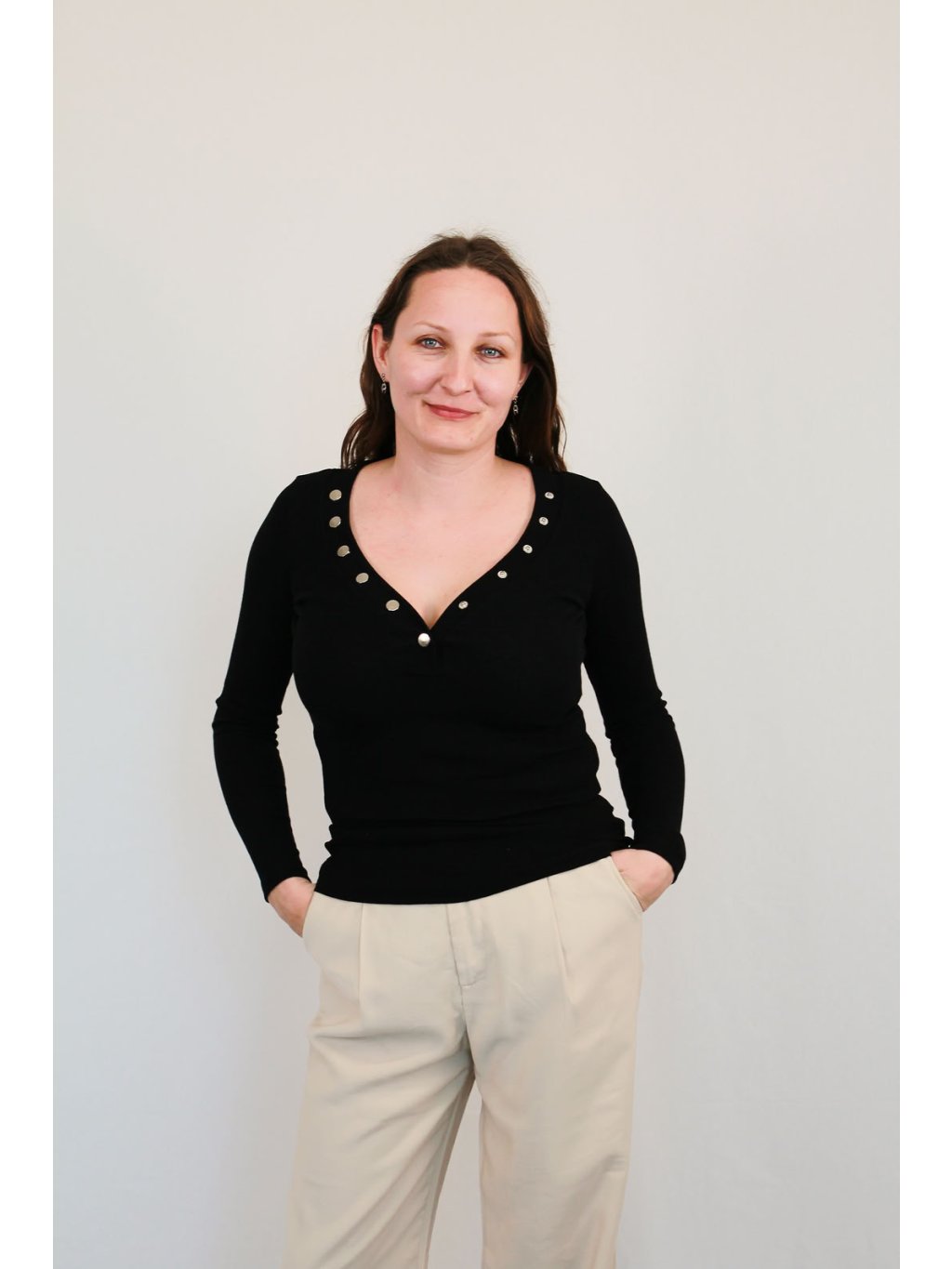 Jednoduché, a přesto výrazné. Tričko Elvaris v černé barvě zaujme na první pohled hlubším výstřihem do „V“, který lemuje ozdobná řada stříbrných cvočků. Přiléhavý střih krásně zvýrazní siluetu, a tak je Liora skvělou volbou pro dny, kdy se chcete cítit sebevědomě a žensky.